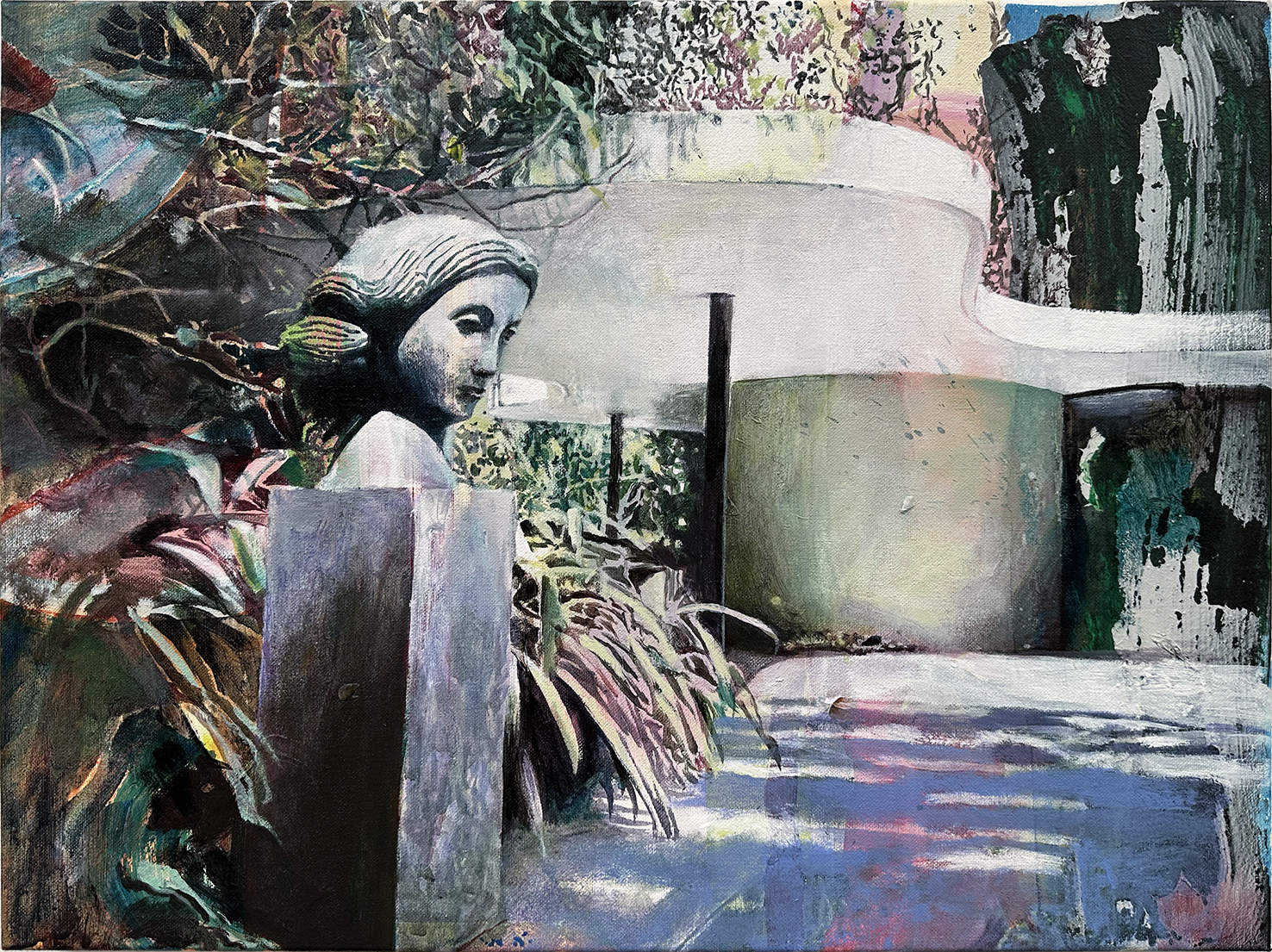 The themes in the paintings of the artist Florian Thomas are our travels and journeys, movement and stillness along with their iconography in popular myths. He finds these in old postcards or private amateur photography, in which he often moves the marginal to the centre of his figurative paintings. The artist also reflects with this imagery our collective desires for far away and exotic places, as well as the private representation of a shared longing for social prestige. With a figurative realism that is overlayed with abstract, blotted colour elements, he also comments on the two media in which he works: painting and photography.